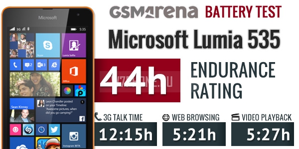 Lumia 535 оснащена аккумулятором емкостью 1905 мАч. В активном режиме — звонки, SMS и постоянная активность в интернете в течение дня — смартфон продержался около 9 часов. Этого достаточно для активного использования при дневном свете. При менее активном сценарии — несколько звонков в день, несколько SMS и один час интернета в день — телефона хватает на два дня и еще остается небольшой запас в 16%. При воспроизведении видео из интернета смартфон показал самый низкий результат — всего на 15 часов опередив категорию 4%.