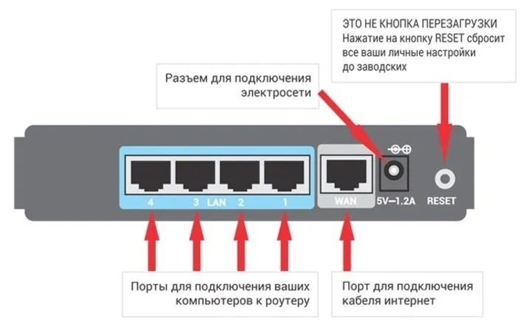 Все роутеры Видите примерно то же самое: Кабели на задней панели, лампочки на передней панели На задней панели находится разъем питания и несколько портов Ethernet (также известных как RJ-45, один из них предназначен для кабеля от провайдера, подписанного как Internet или Signed (external network)) Остальные порты являются локальными (❶), для подключения домашний компьютер, телевизор и другие устройств На задней панели имеется кнопка сброса, которая точно сбрасывает настройки. все настройки И пароль сброса к заводским настройкам, чтобы случайно не коснуться его, кнопка обычно отретуширована, и вы можете просто нажать ее прямой скрепкой или другим тонким предметом.