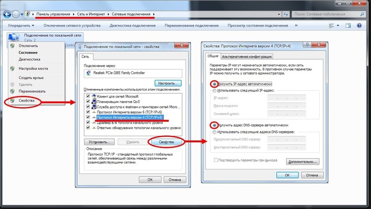 Особые настройки самого роутера могут мешать подключению По кабелю. В этом случае также помогает сброс к заводским настройкам. настройкам . Если после сброса настроек вы все еще не можете подключиться, значит, что-то не так в настройках вашего компьютера. Перейдите в окно Сеть подключений Проверьте свойства панели управления и активной сети. подключения (Щелкнув правой кнопкой мыши на соответствующем значке и выбрав «Свойства» из выпадающего меню). Интернет-протокол IPv4 должен быть настроен на автоматическое получение IP-адреса и DNS-сервера.