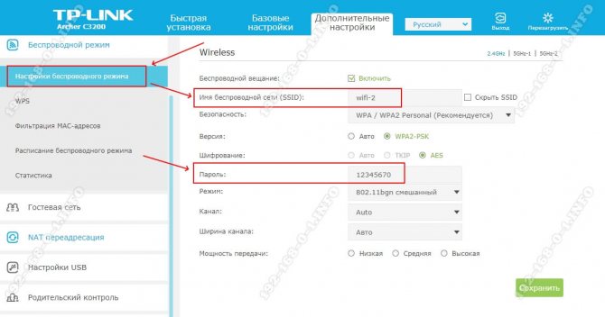 - Беспроводные сети (Wi-Fi, Беспроводной режим и т.д.) — страница расширенных настроек Wi-Fi для изменения имени сети, пароля, дополнительных параметров и включения гостевой сети.