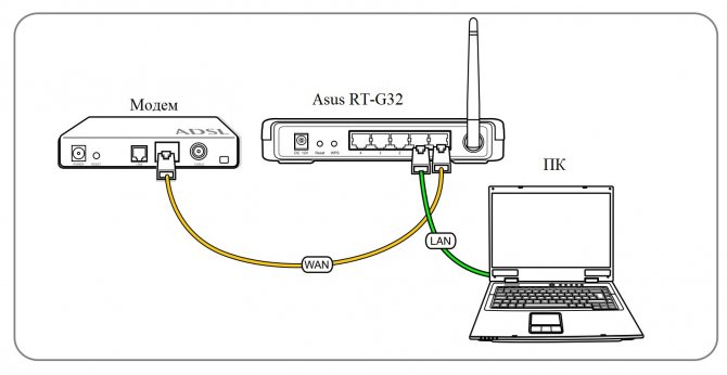 Необходимо соединить модем и маршрутизатор, затем с помощью коммутационного кабеля через порт LAN компьютер и модем.